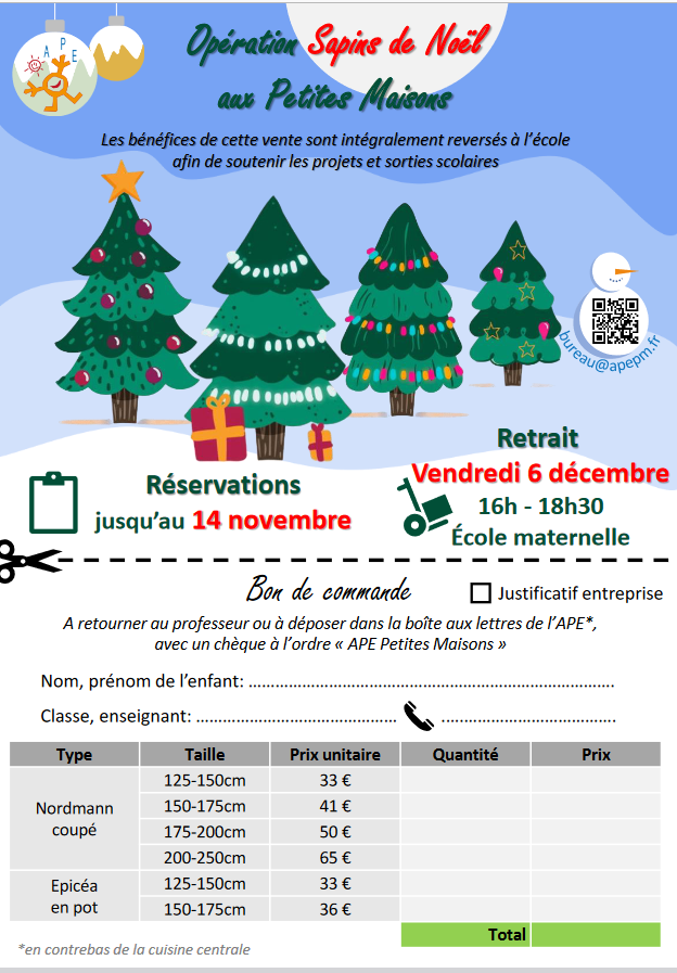 ♦ Transmettre le bon de commande accompagné du règlement correspondant par chèque à l'ordre de l'APE des Petites Maisons dans le cartable de votre enfant, ou dans la boîte aux lettres de l’APE qui se trouve en contrebas du bâtiment de la cuisine centrale.